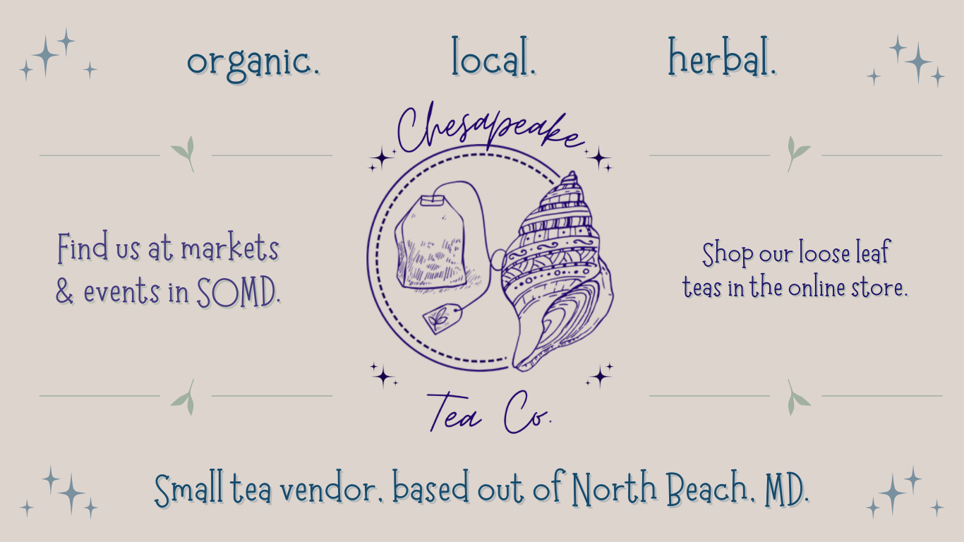 We handcraft organic, loose-leaf, herbal (and caffeinated) tea blends. Each ingredient is carefully and intentionally selected with your health and happiness in mind. We are a small business, run from North Beach, MD, but we ship nationwide. You can find us at vendor events in the DMV area and buy our full menu of teas online (linked above).